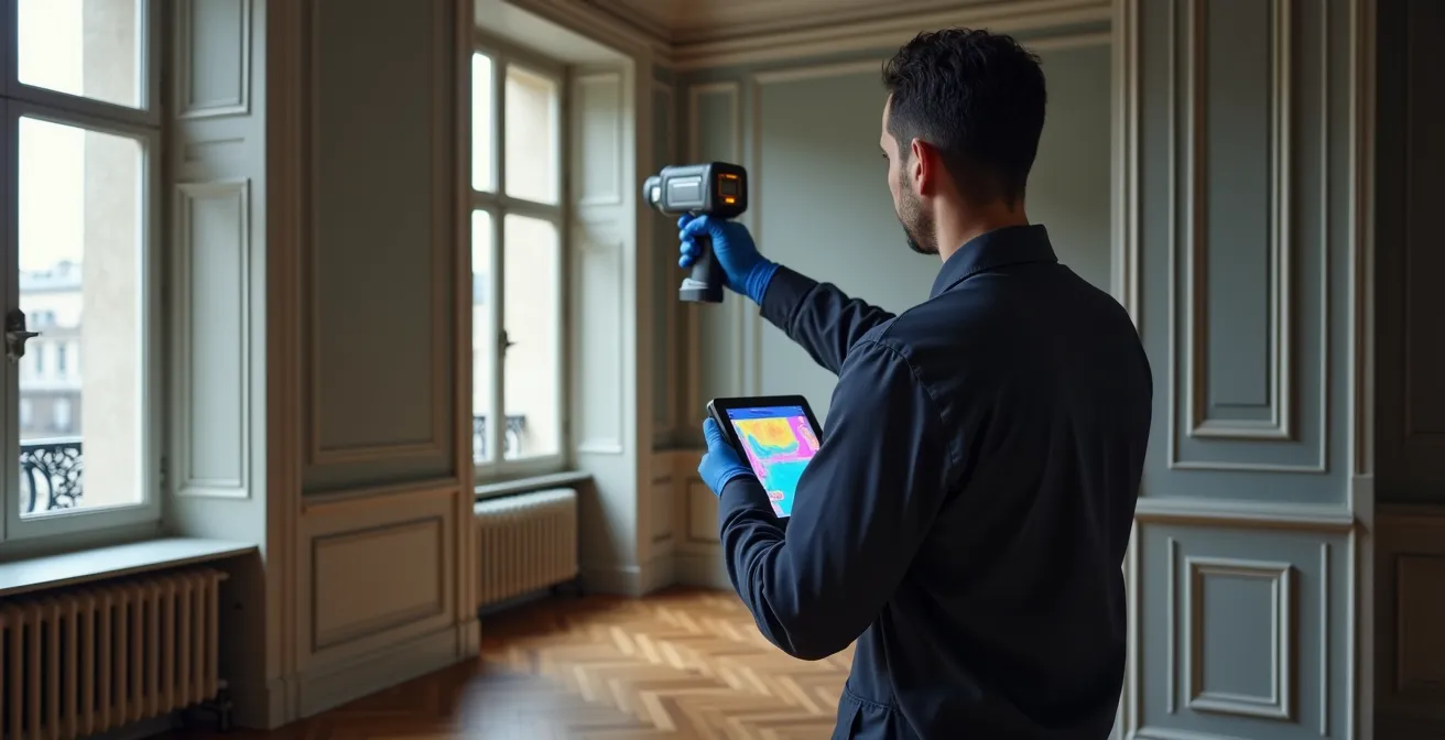 Le diagnostic différentiel est alors essentiel. Une recherche par caméra thermique permet de faire une première distinction cruciale. Une fuite active se manifeste par une zone froide persistante. Une zone de condensation, liée à une ventilation insuffisante, verra sa température varier au cours de la journée. Des remontées capillaires, quant à elles, montreront un gradient d’humidité partant systématiquement du sol. Cette analyse technique est indispensable pour ne pas engager des travaux inutiles sur une mauvaise hypothèse.